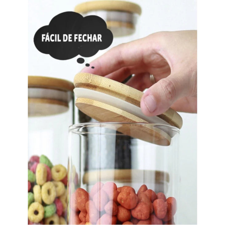 Conjunto de Potes Herméticos de Vidro com Tampa de Bambu Mantimentos Condimentos Empilháveis